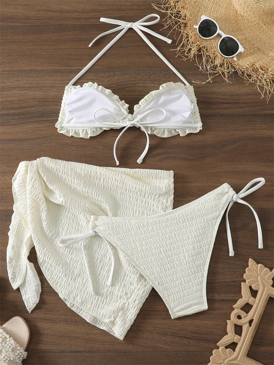 New Solid Ribbed Halter 3 Piece Bikini Set